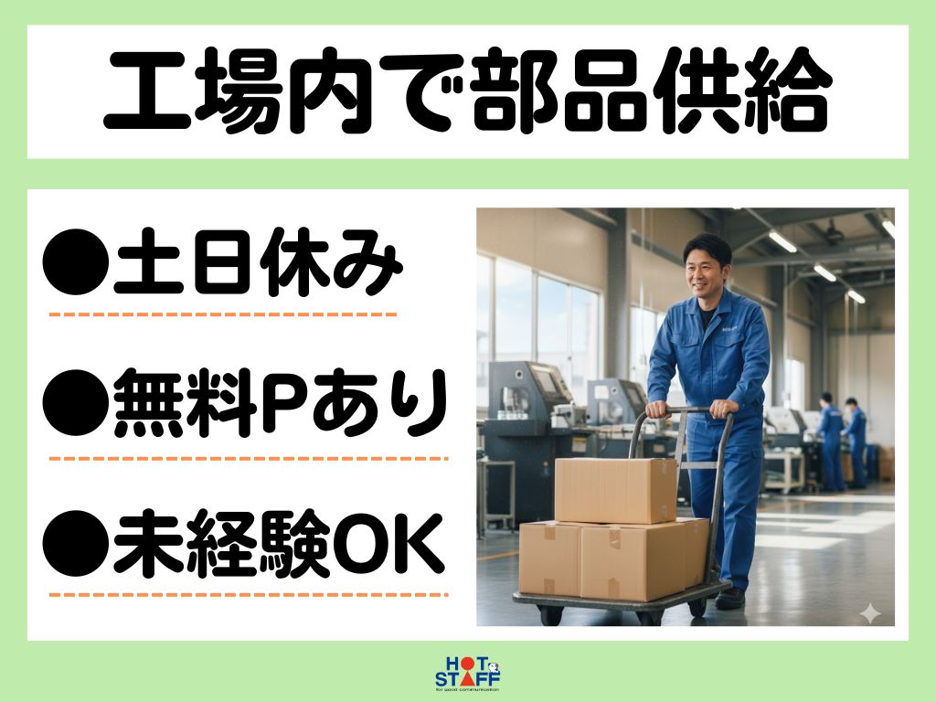 《工場内を回り台車を使って部品や箱の補充》8:10~17:10/車通勤OK/土日休み/カンタン作業◎