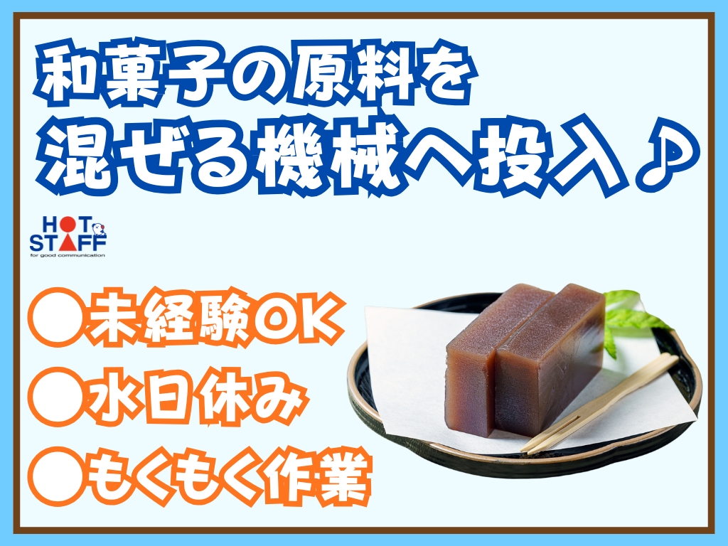 《和菓子の原料を機械へ投入やできあがったお菓子の運搬》未経験◎/7時半~16時半/水日休み/残業なし