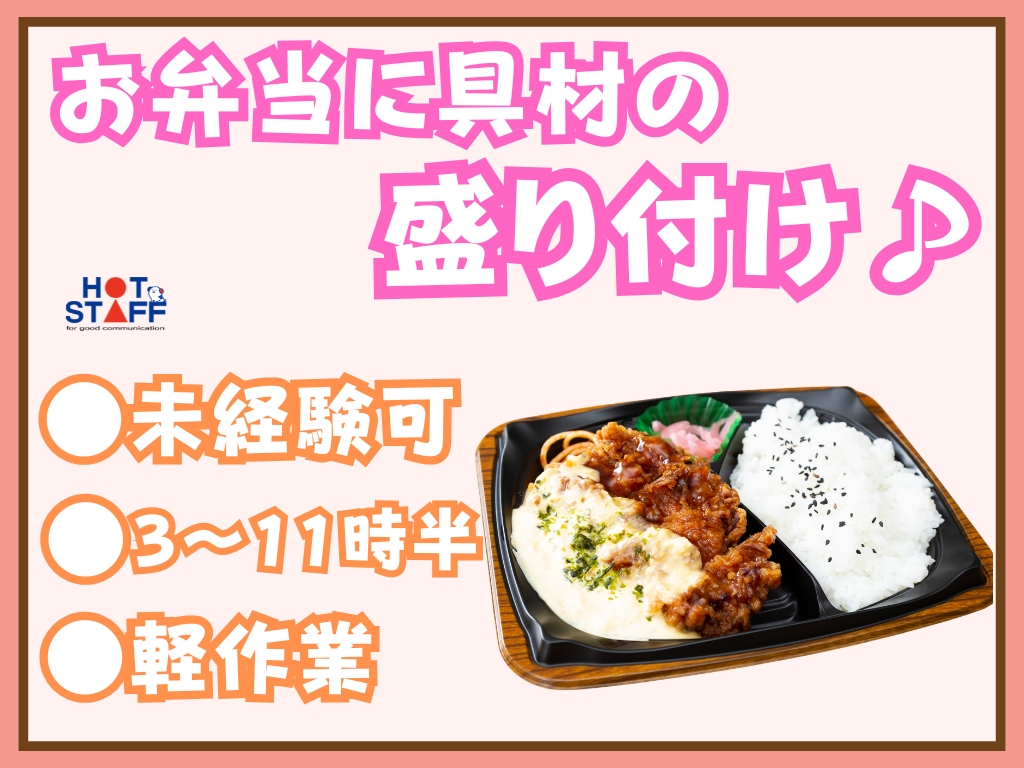 《ベルトコンベアで流れるお弁当箱に具材の盛り付け♪》未経験◎/3時~11時半/空調完備/軽作業
