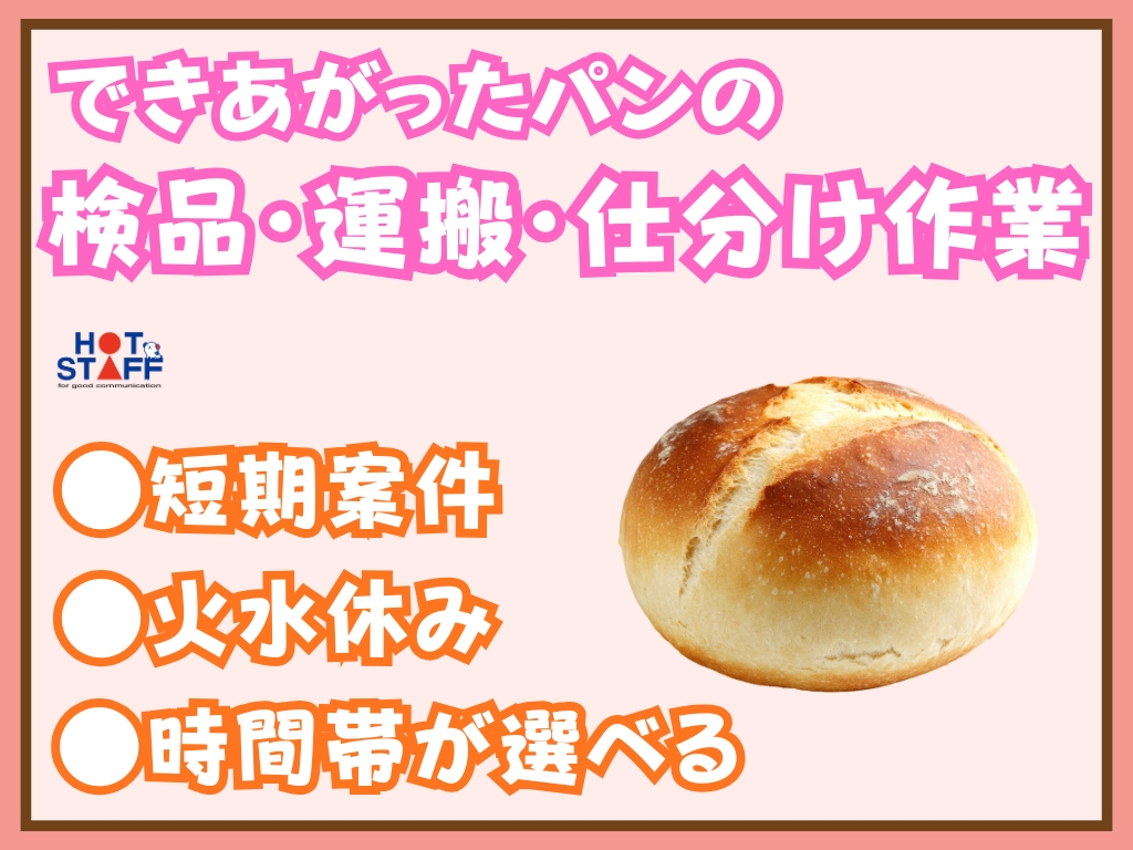《パン工場でパンの検品・運搬・仕分け作業♪》4/15までの短期/時間帯が選べる/残業なし/火水休み