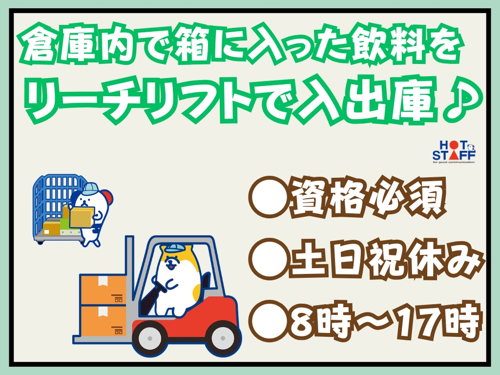 《倉庫内で箱に入った飲料をリーチリフトで入出庫作業♪》経験・資格を活かす/土日祝休み/8~17時