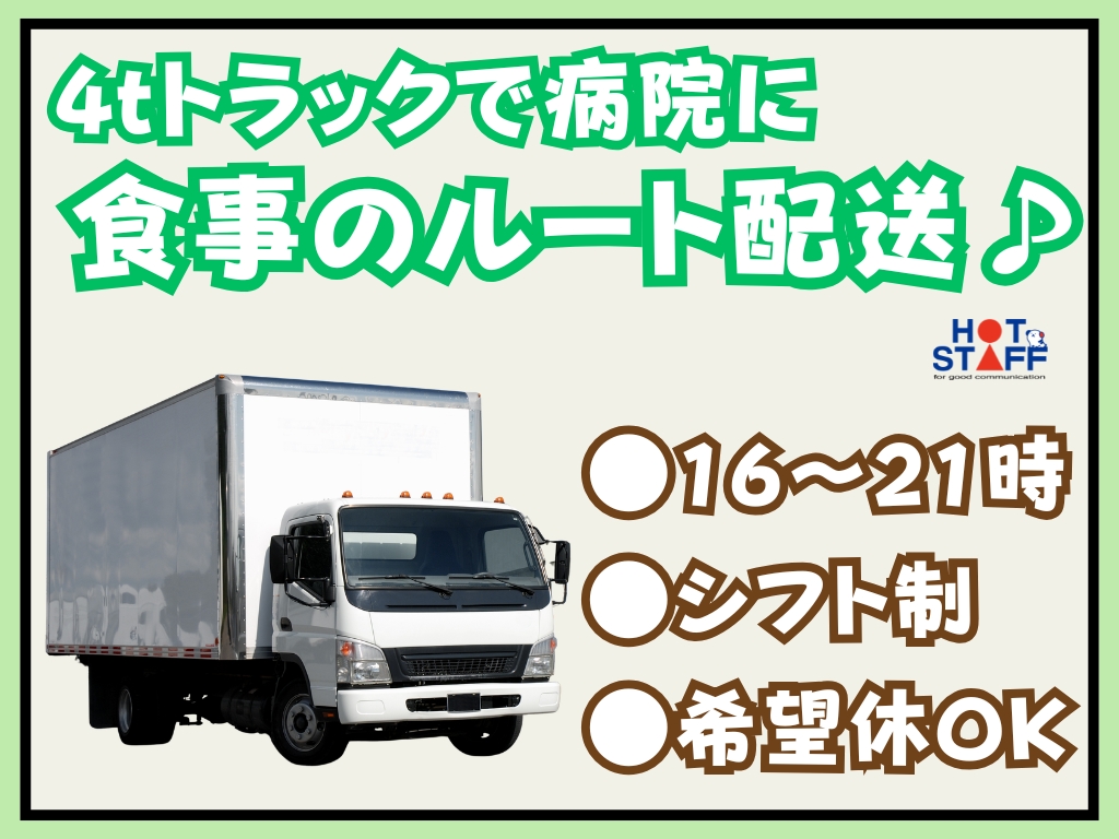 《4tトラックで病院に食事のルート配送♪》16時~21時/希望休の相談OK/シフト制/中型免許必須