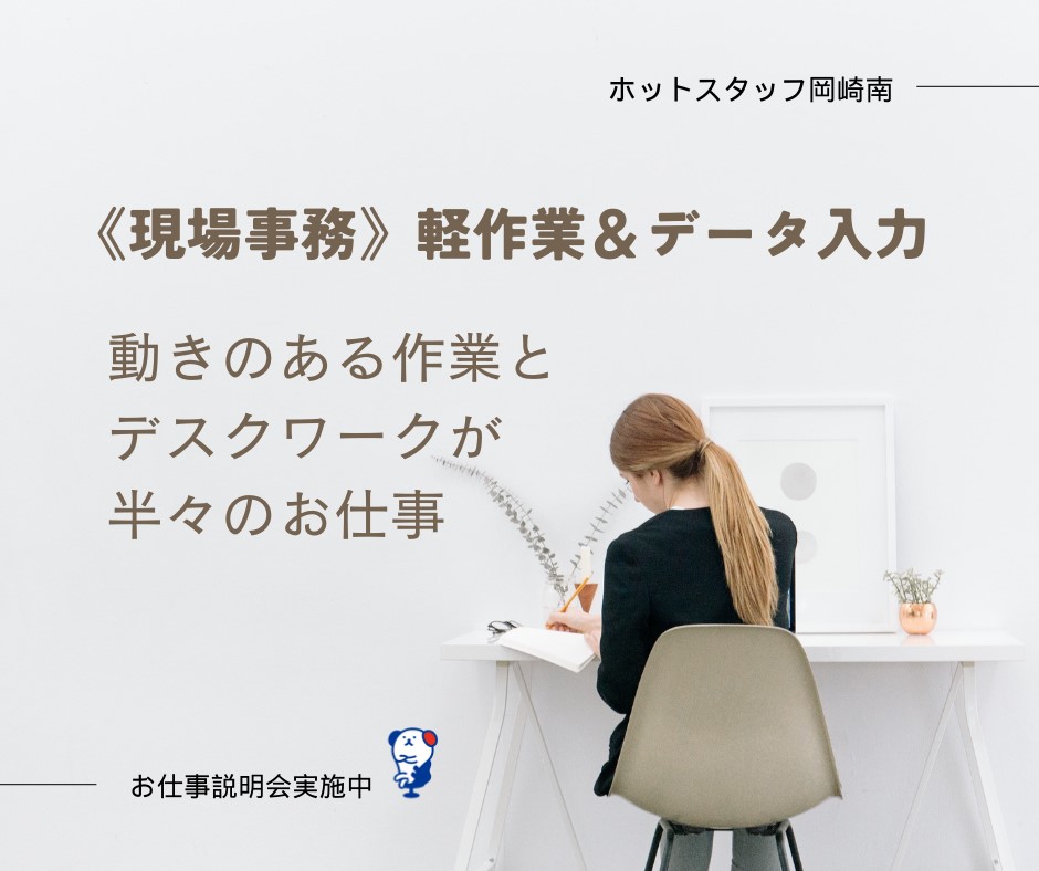 来年1月スタート|データ入力事務&モクモク軽作業(座り作業)|JR岡崎駅・名鉄美合駅~無料送迎あり