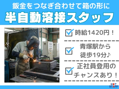正社員登用の実績あり◎/日勤専属♪/青塚駅から徒歩19分/鈑金を半自動溶接で箱の形にしてバリ取り♪
