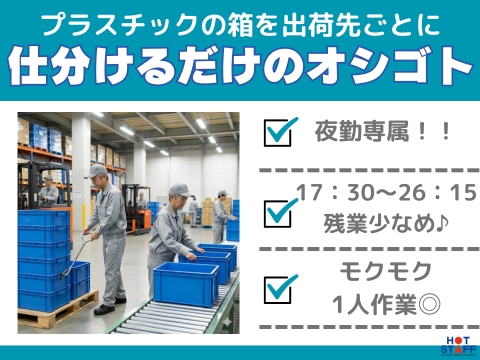 夜勤専属!/17:30~26:15/軽作業♪/プラスチックの箱をフック付き棒を使用しパレットに積む