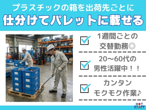未経験スタート応援!/1週間ごとの交替勤務◎/プラスチックの箱を仕分けて専用の棒を使いパレットに積む