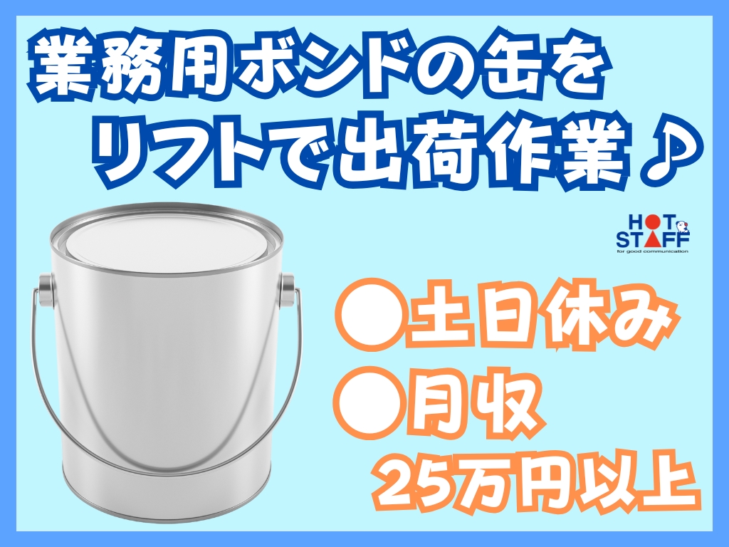 《業務用ボンドの缶などをカウンター・ハンドリフトで出荷作業♪》免許必須/土日休み/月収25万円以上