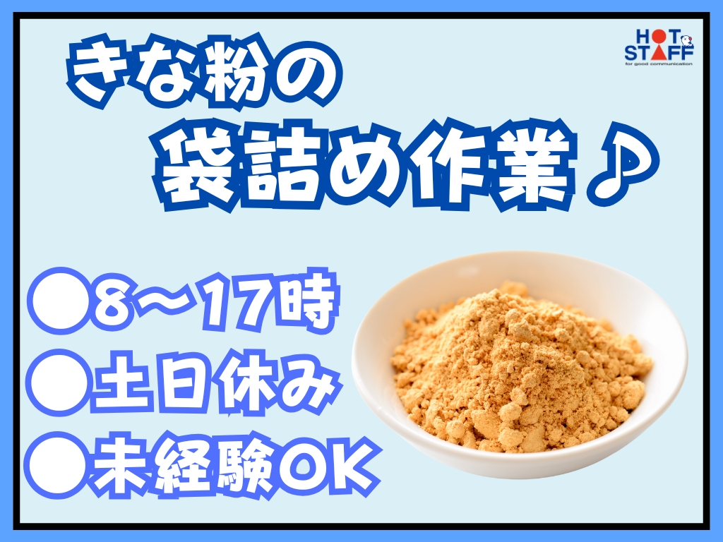 《きな粉が流れてくる機械口に袋のセットや重さを量ったり♪》未経験◎/8~17時/土日休み/空調完備