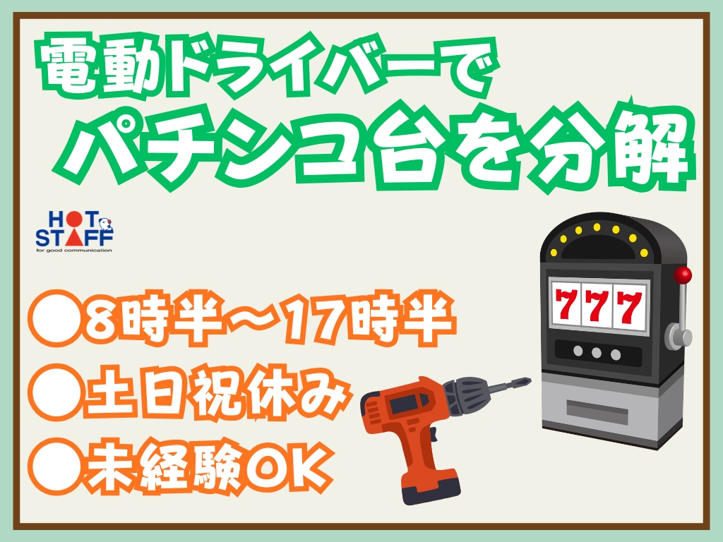 《パチンコ台を固定機械にセットして工具で分解♪》未経験◎/8時半~17時半/土日祝休み/空調完備