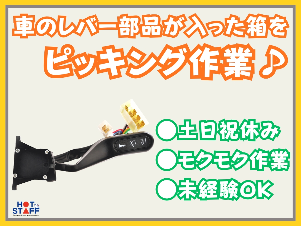 《車のレバー部品が入ったプラスチック箱をピッキング♪》未経験◎/土日祝休み/空調完備/モクモク作業