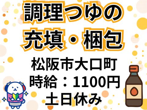 松阪市大口町/もくもくおしごと!日勤・夜勤の相談もOK!土日休み♪調理つゆの充填・梱包スタッフ