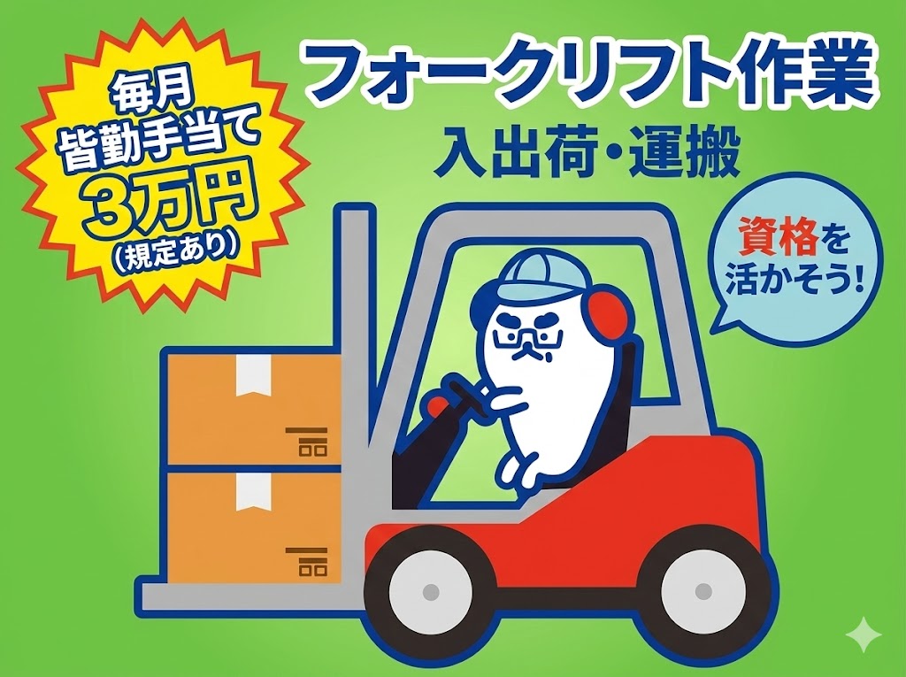 【毎月皆勤手当3万円】1日の6~8割がフォークリフト業務!時給1350円以上★