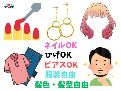 服装・髪色・髪型自由!ネイル・ピアス何でもOK!