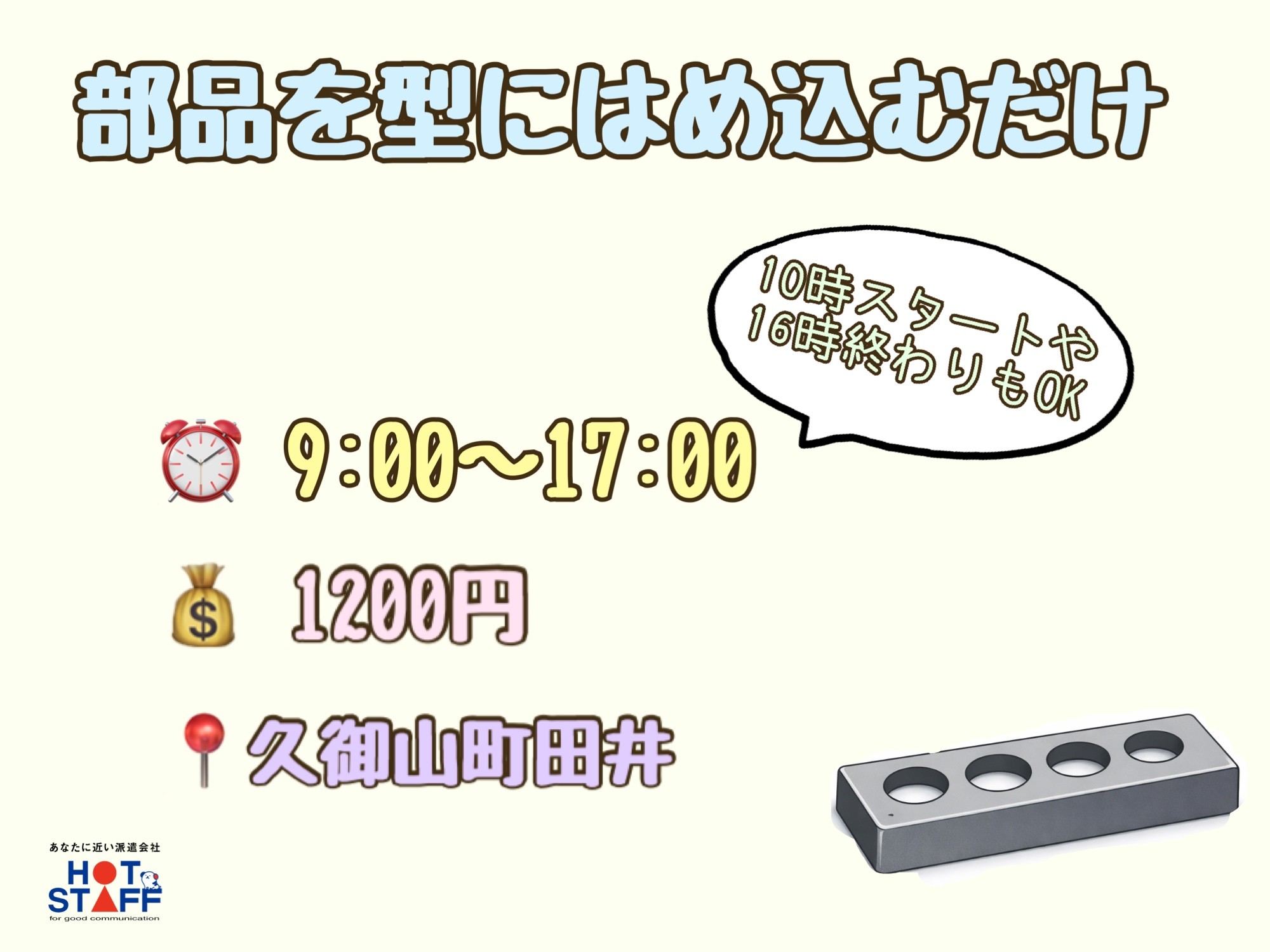 時間帯の相談OK◎/週3日~OK・空調完備・かんたん軽作業/手のひらサイズの部品を型にはめ込むだけ☆