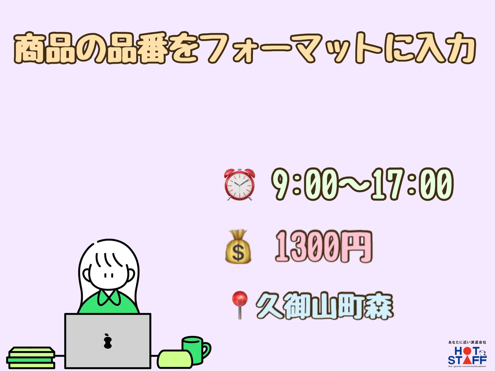 長期休暇あり◎/日勤・土日祝休み・ネイル&ピアスOK/書類を見ながら色々な商品の品番入力作業♪
