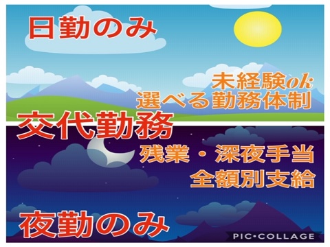 月収例 時給1400円×実働8時間×20日勤務+夜勤手当時350円×実6h×10日=24万5000円