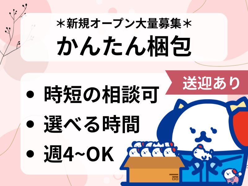 <*11月から新規オープン*>大量募集中!2箇所から送迎あり◎未経験歓迎*かんたん梱包作業*週4日~OK!時短の相談OK♪