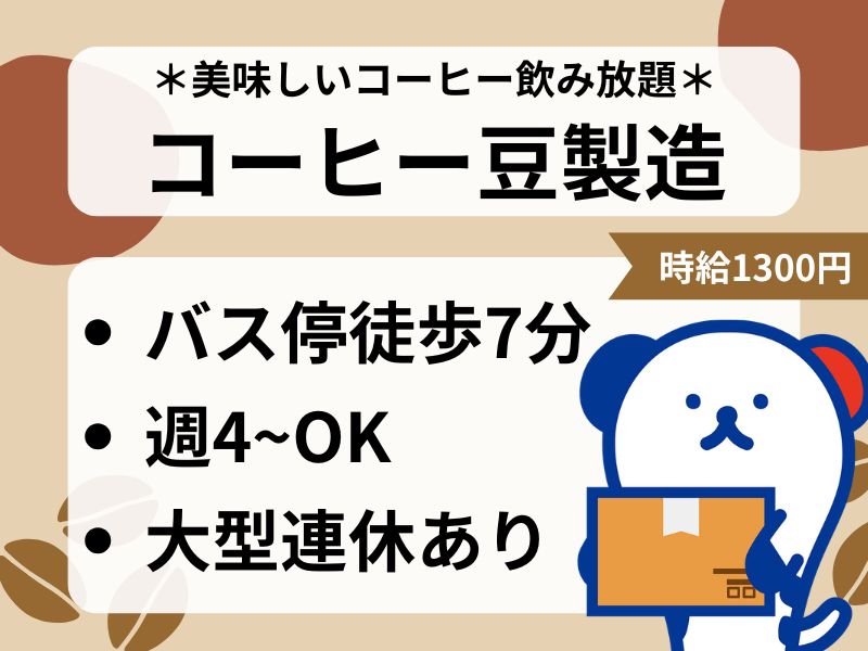<コーヒー飲み放題◎>高時給!コーヒー豆製造サポート*未経験歓迎!土日祝休み*バス停~徒歩7分♪