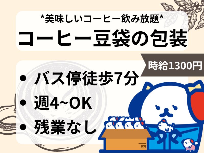 <コーヒー飲み放題◎>高時給!コーヒー豆製造サポート*未経験歓迎!土日祝休み*バス停~徒歩7分♪
