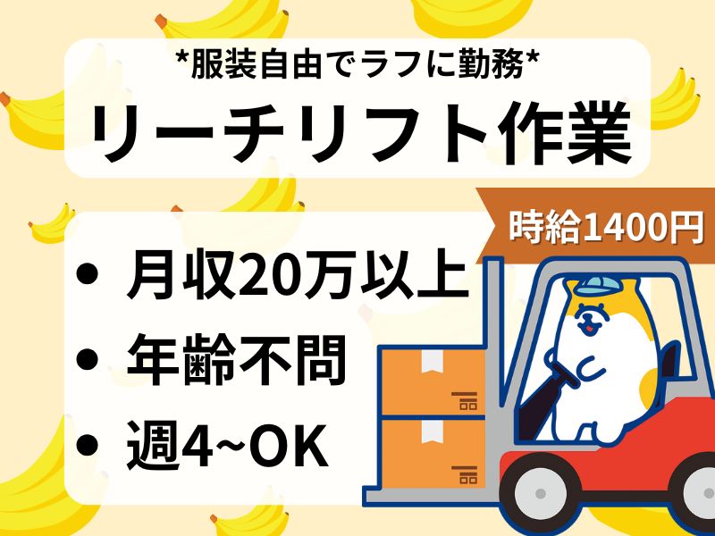 <日曜+1日休み◎>週4日~OK!リーチリフトでの果物入出庫*服装自由*高時給1400円◎中央市場前駅から徒歩10分♪