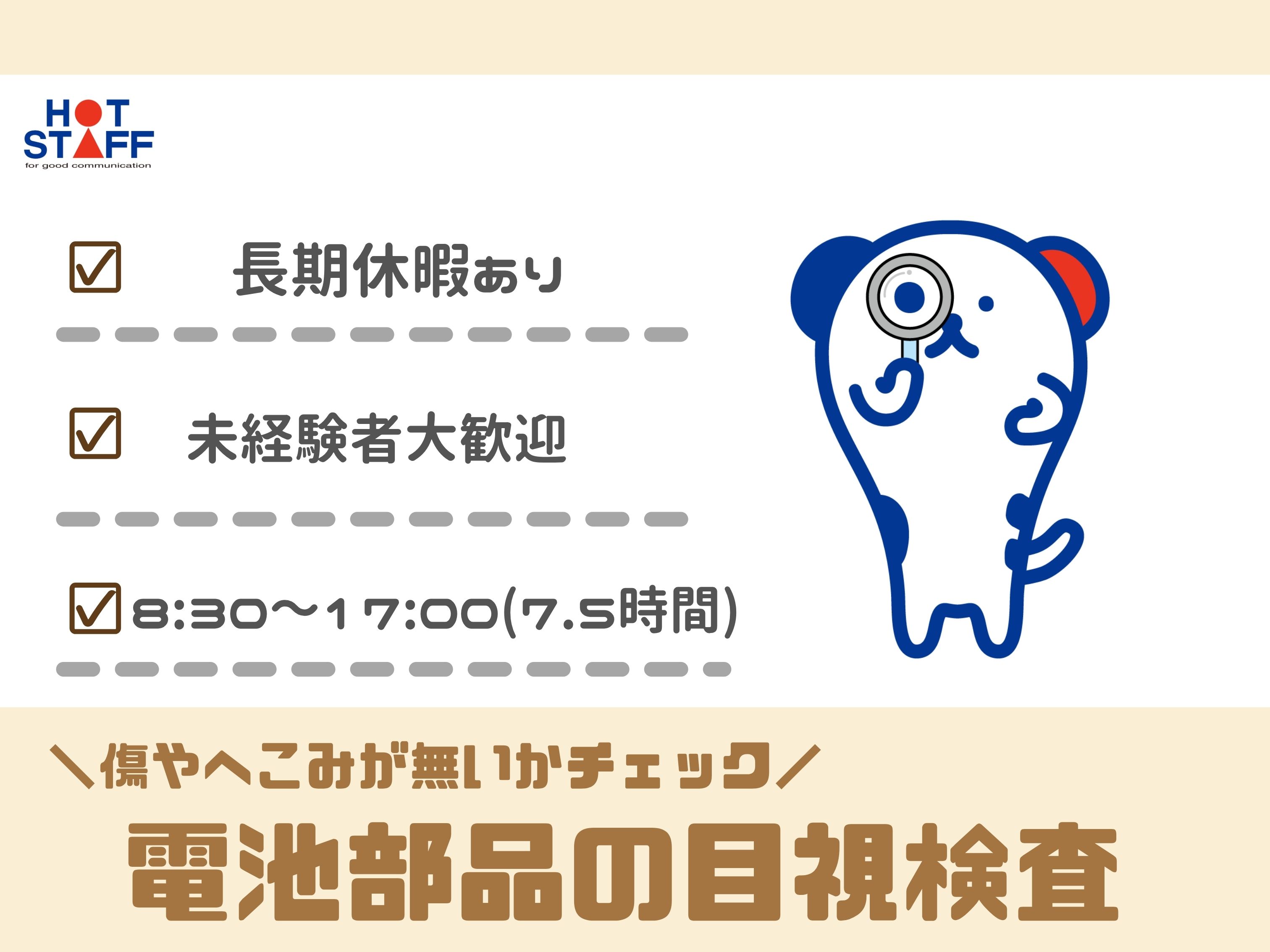 土日祝休みのもくもく作業がしたい方♪/日勤・残業なし・長期休暇あり/電池部品の傷やへこみの目視検査