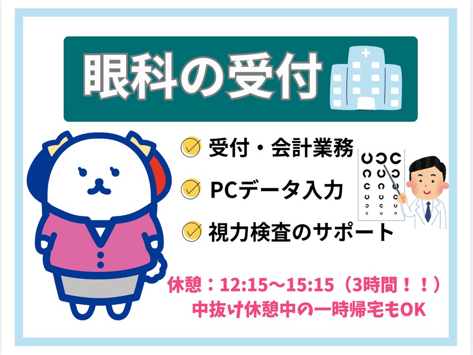 \休憩たっぷり3時間♪/眼科クリニックの受付・検査補助/週2日は午前のみ勤務です♪