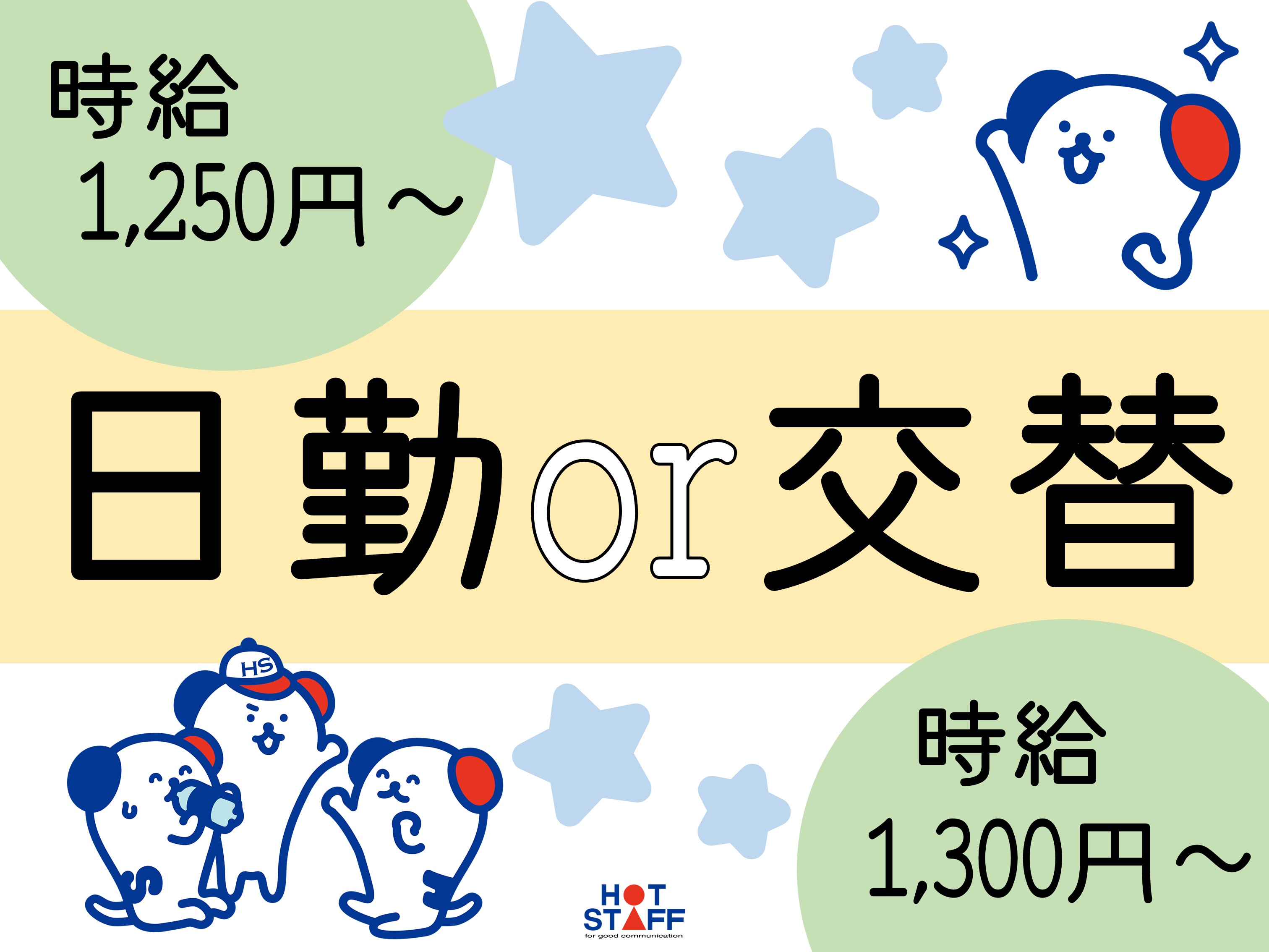[収入例] ▼日勤専属(8:30~17:20) 時給1,250円×7時間40分×約21日 =201,000円以上可能!+交通費(規定) ▼交替勤務 (5:30~13:45/13:45~22:00) 時給1,300円×7時間15分×約21日 =197,000円以上+残業代 =210,000円以上可能!+交通費(規定)
