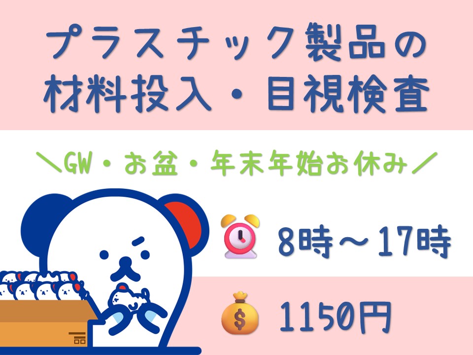 土日お休み・残業少なめ◎/材料を機械に投入・プラスチック製品の目視検査■南区・時給1150円■