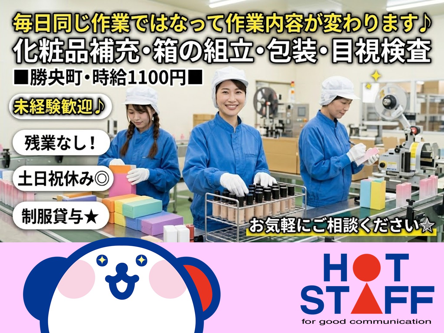 毎日違う作業で飽きない♪化粧品の補充や箱の組立★未経験OK!■勝央町・時給1100円■