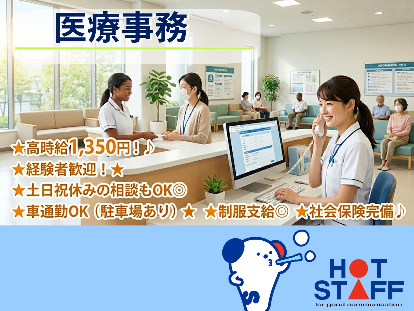 病院の受付スタッフ★レセプト業務なし◎事務経験がしっかり活かせるお仕事です♪■南区・時給1350円■