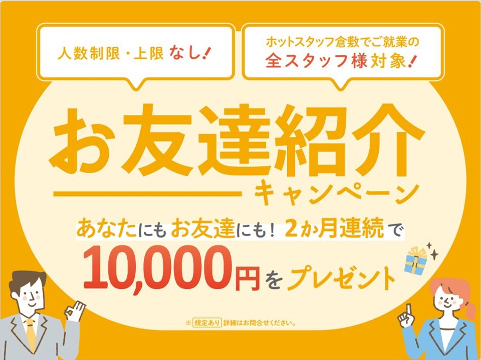「ホットスタッフ倉敷」ならお友達を紹介して頂くと・・・<紹介して頂いた方>と<紹介された方>も!