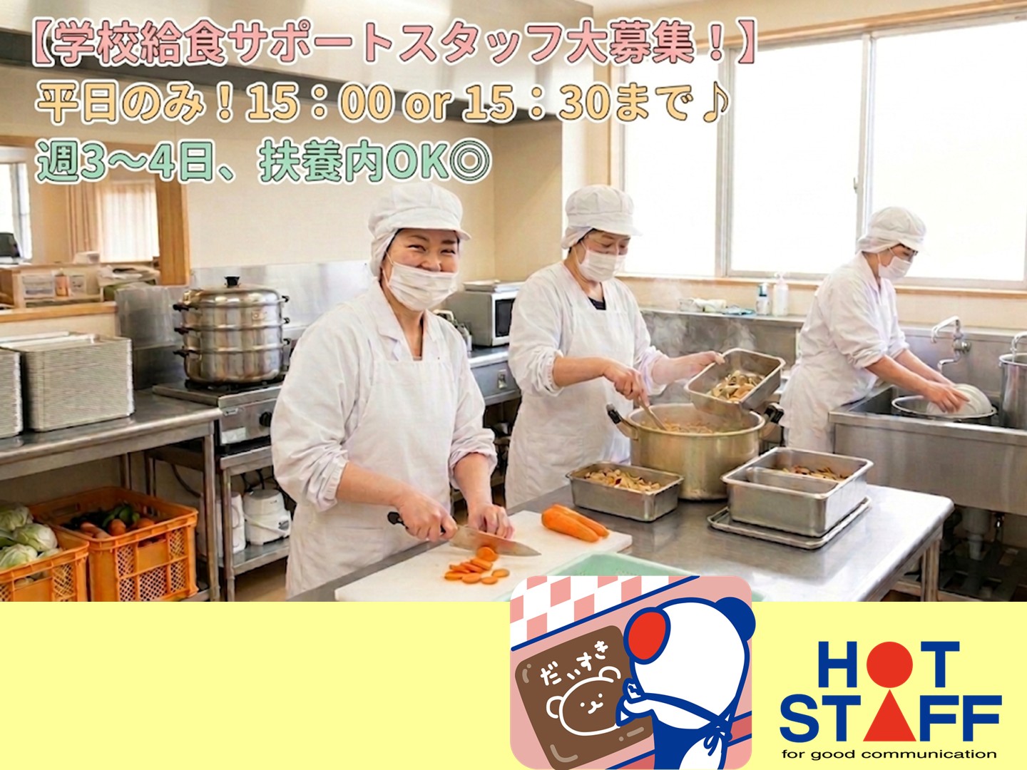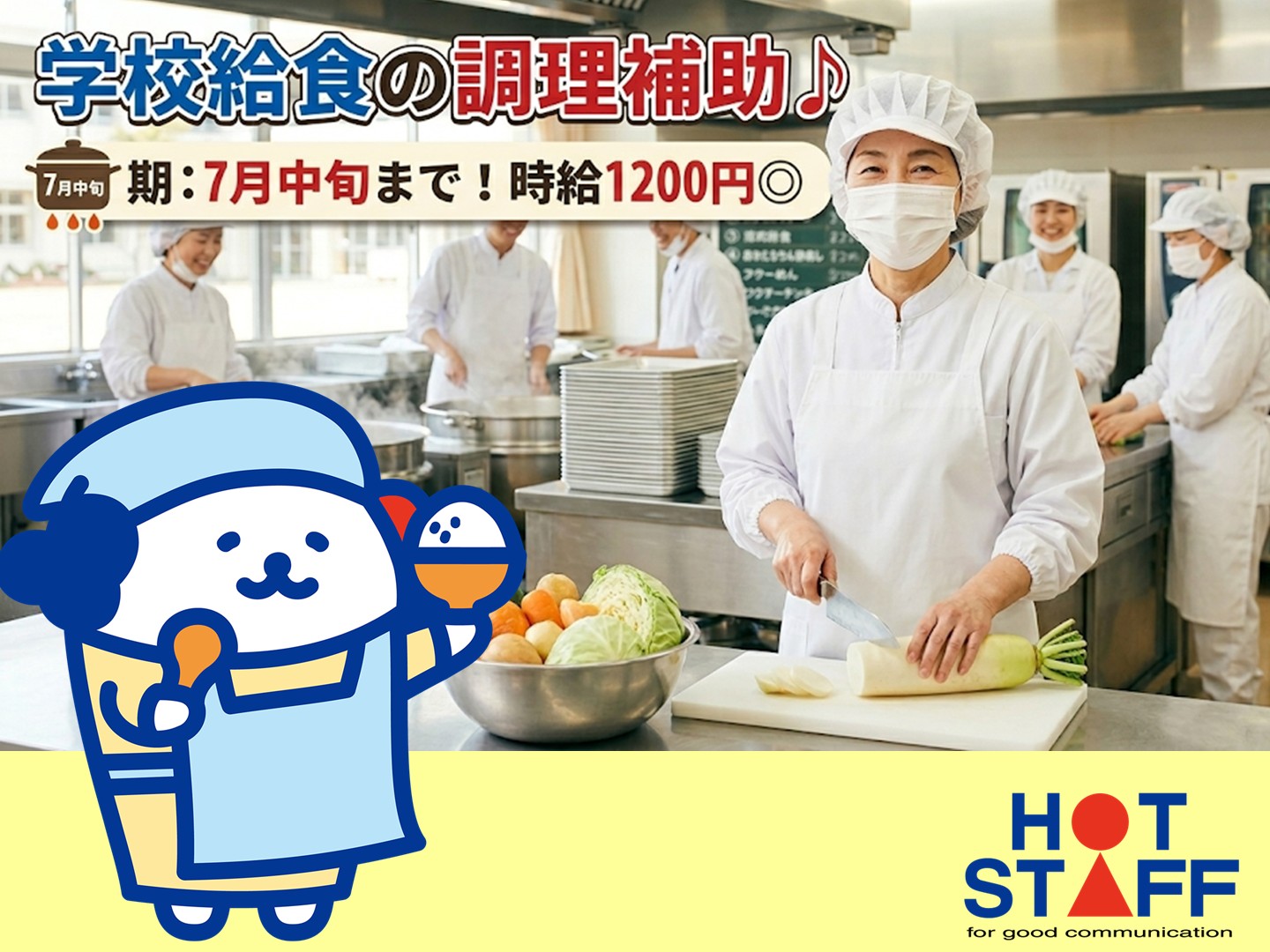 R8.7月中旬まで!土日祝お休みで料理スキルが活かせる♪学校給食作り■東区・時給1200円■