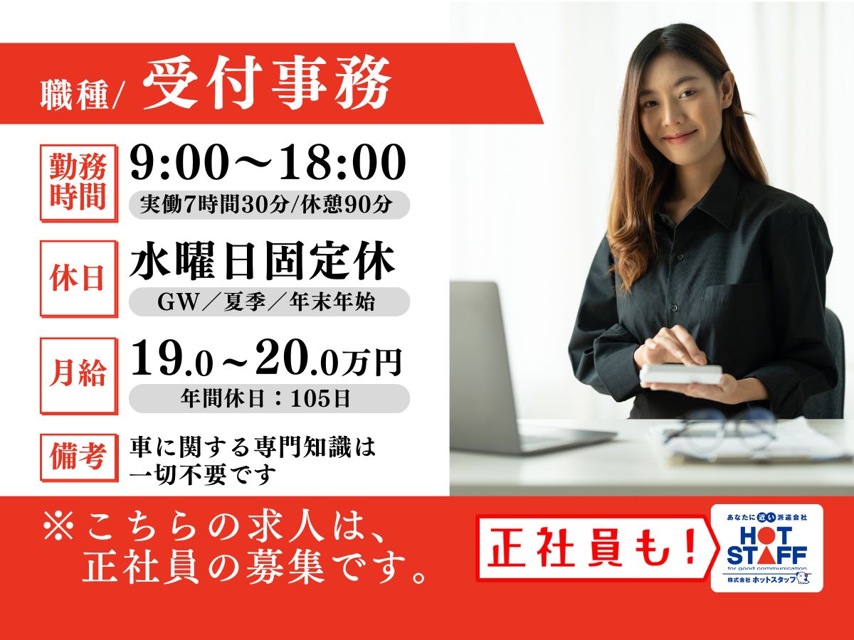 正社員募集★未経験OK!クルマ販売店の受付スタッフ♪クルマについて詳しくなくても大丈夫☆彡