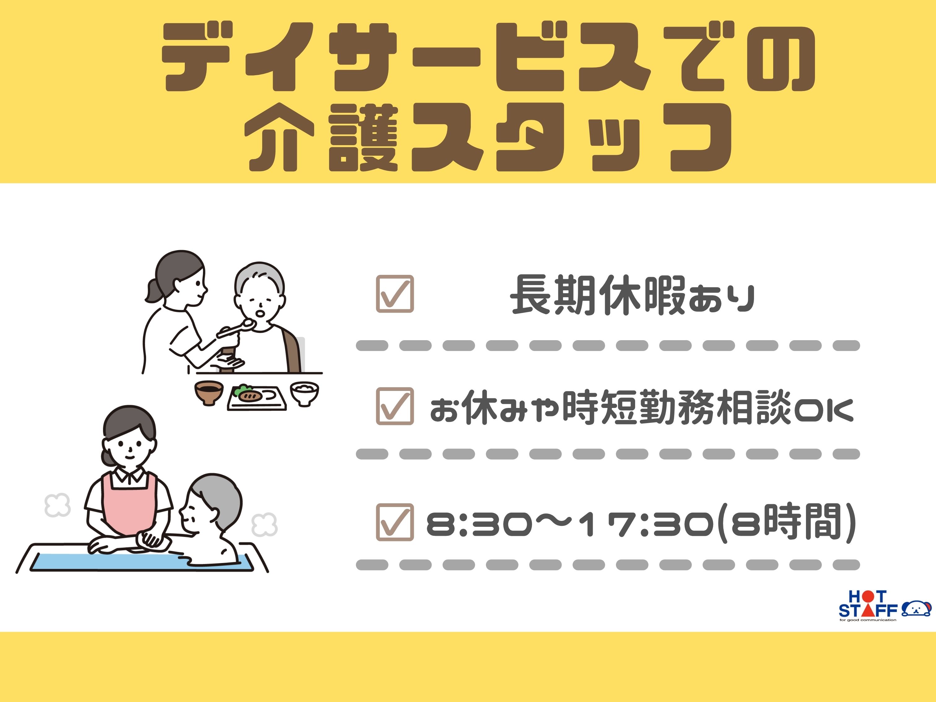 日勤・週3日~でお探しの方必見☆/土日休み/年末年始・お盆休みあり/デイサービスで介護スタッフ