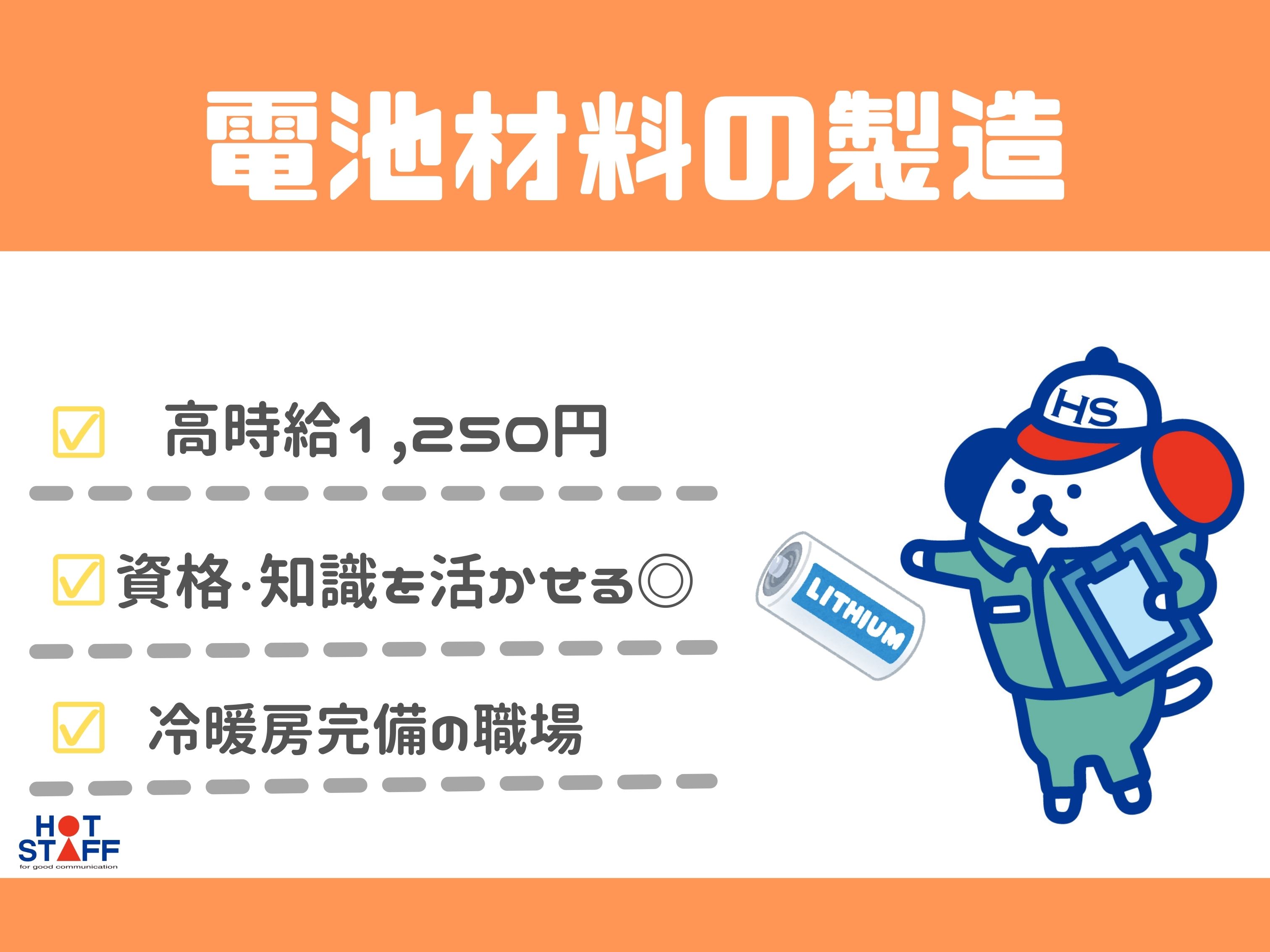 危険物取扱資格や化学の知識を活かせるお仕事♪/土日祝休み・日勤/電池材料の製造