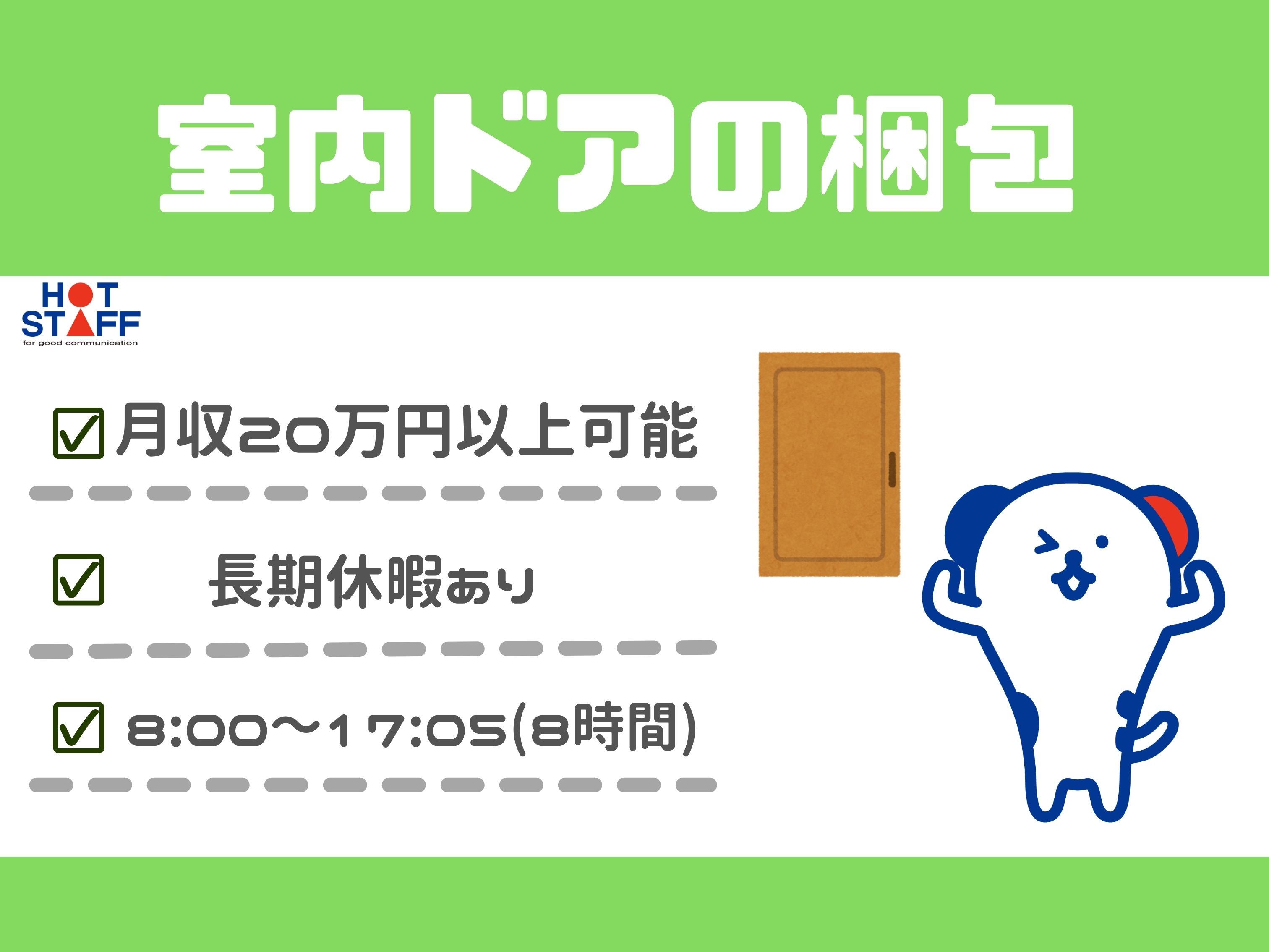 体を使って働きたい方、必見♪/(土)日祝休み・日勤・長期休暇あり/室内ドアの梱包や養生作業
