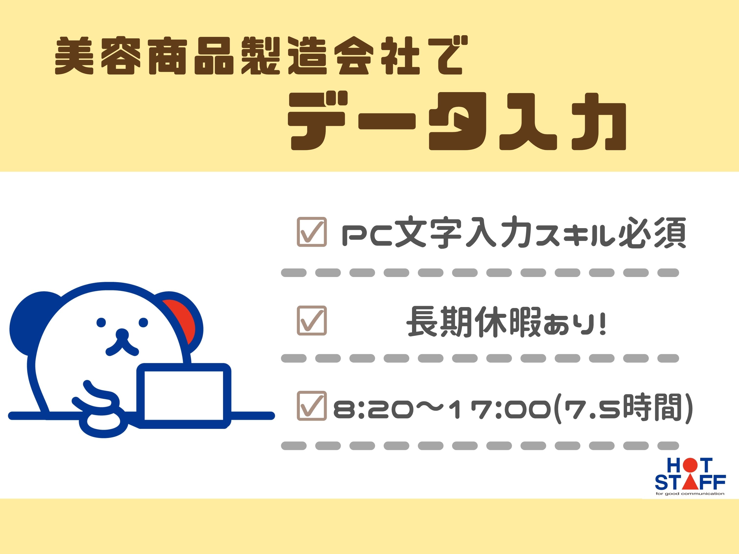 PCスキルを活かして事務デビュー♪/土日祝休み・長期休暇あり/化粧品などを製造する企業でのデータ入力