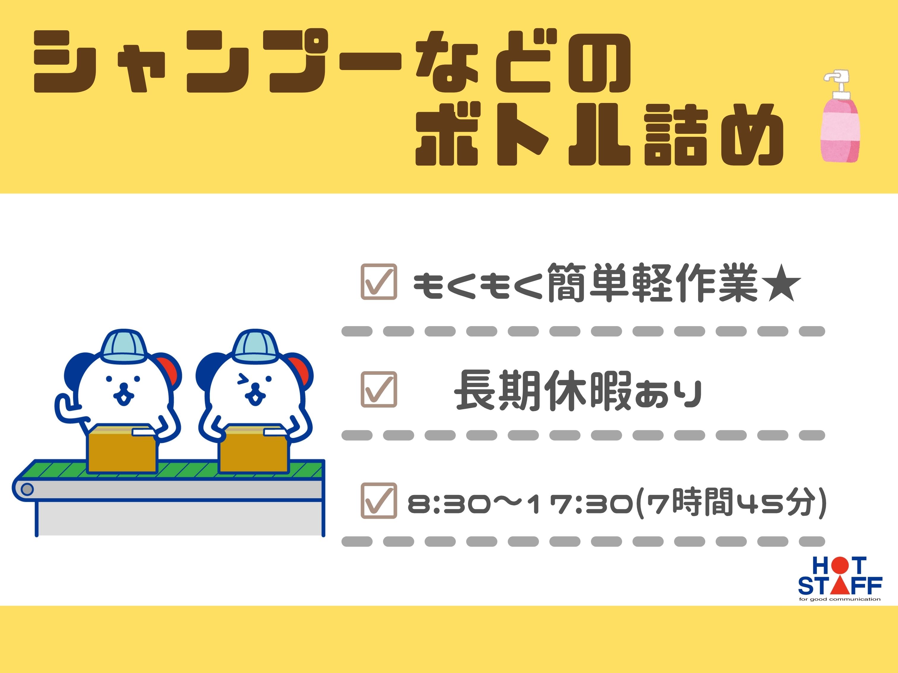 カンタンもくもく作業がしたい方必見♪/土日祝休み/シャンプー等のボトル詰めや梱包のライン作業