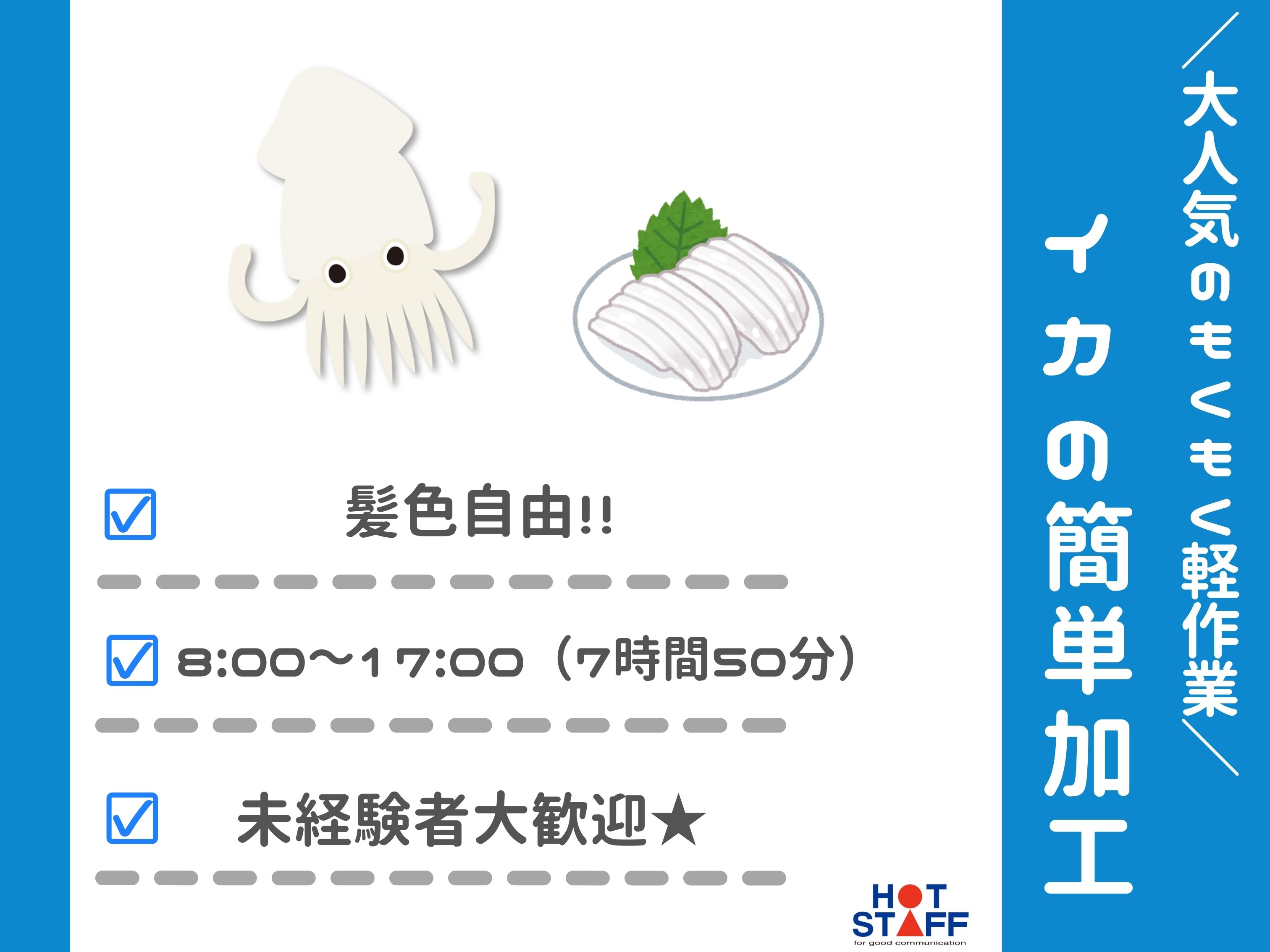 【もくもく簡単作業★水日祝休み・8時~17時】月収18万円以上/イカを機械にセットするお仕事くコ:彡