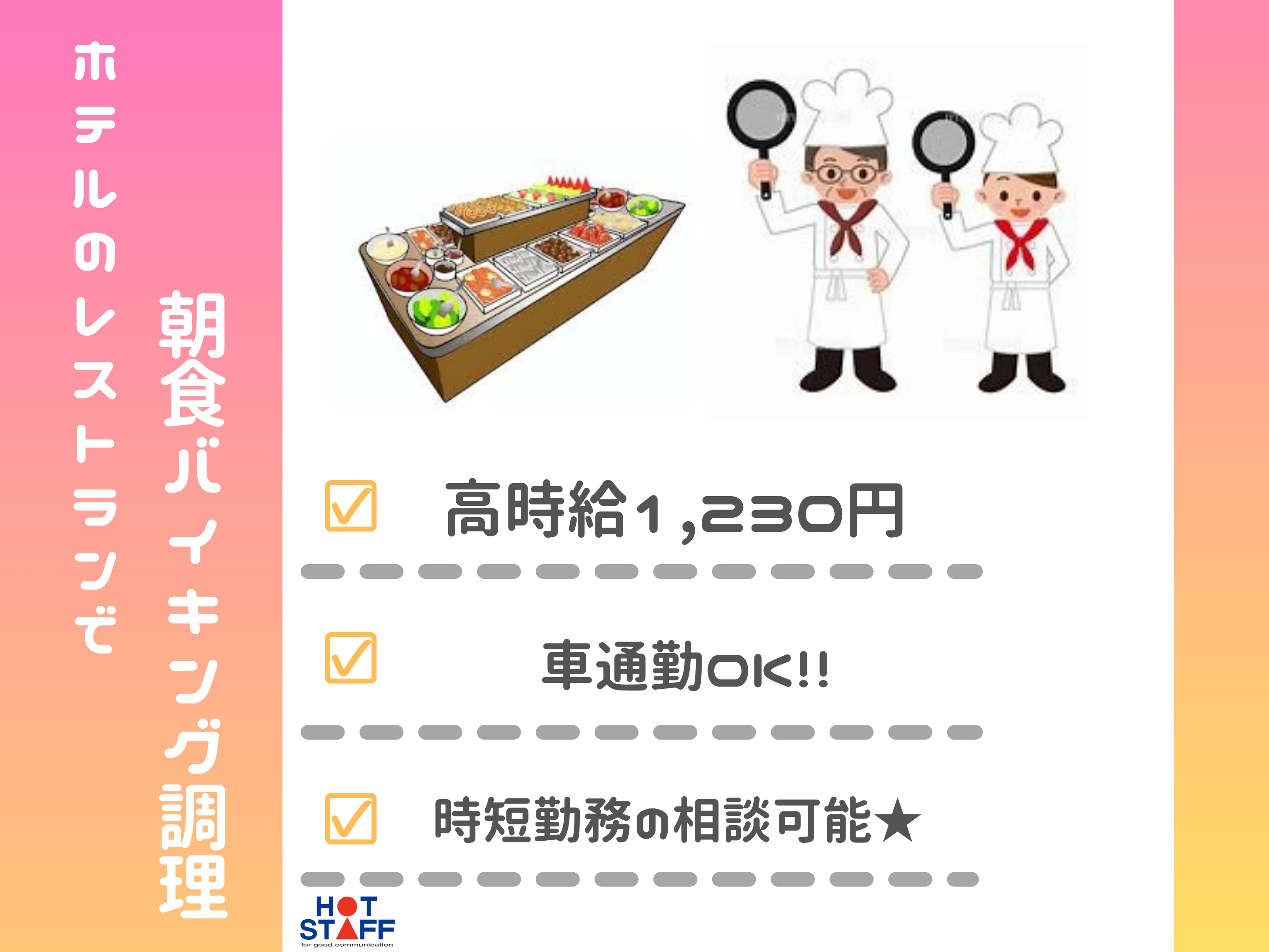 《綺麗なホテル内での調理スタッフ》朝5時スタートの1日6時間勤務☆彡お昼からはゆっくり♪朝食バイキングの調理をお願いします☆
