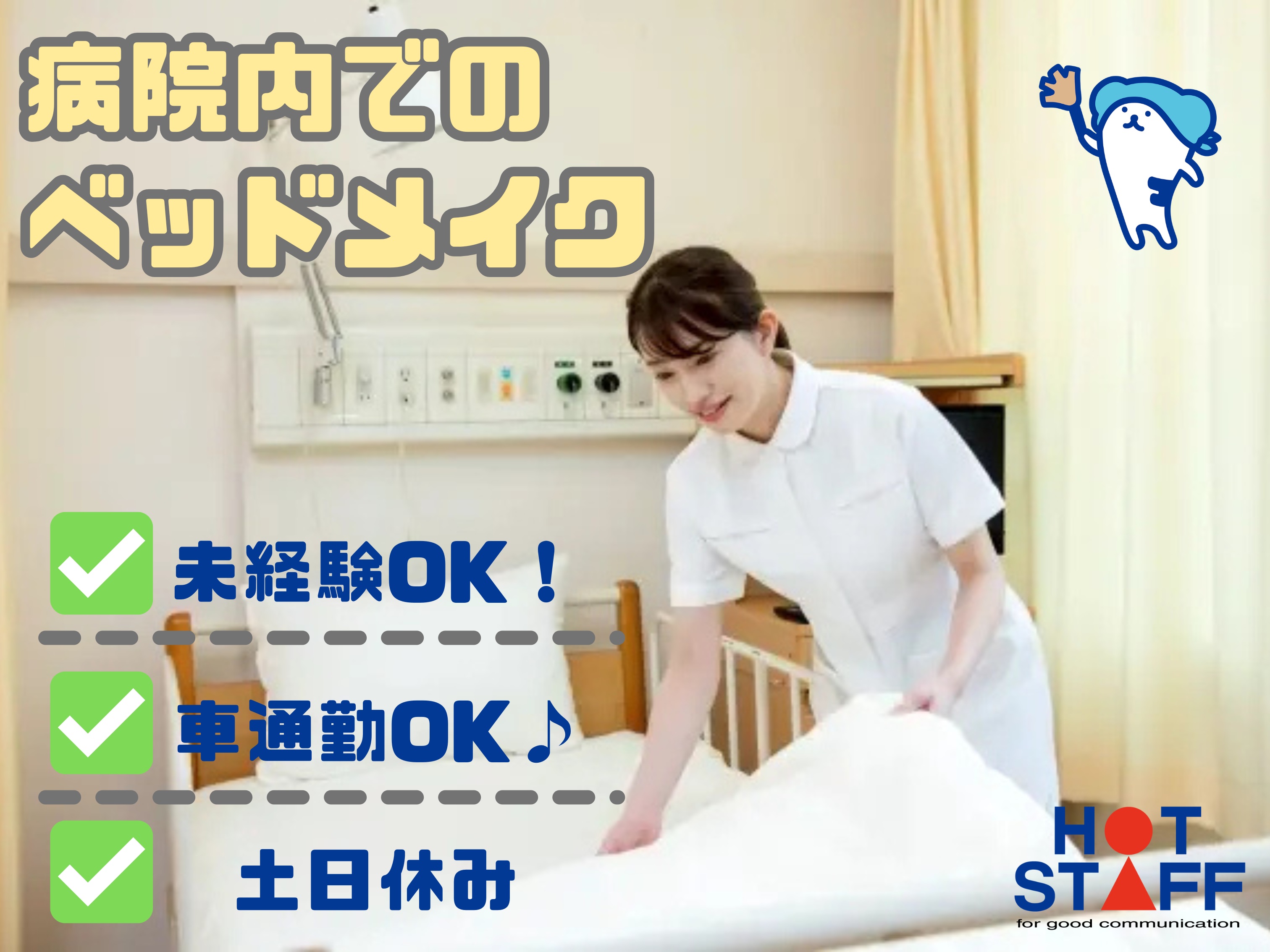 【土日休み】時給1,150円★総合病院でベッドメイキング♪2人1組のペア作業で未経験も安心◎残業ほぼなし×家事スキルが活かせるお仕事!