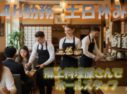 飲食店でホールスタッフ/土日休み/4h勤務/まかない有り/ネイルピアスOK/髪色自由