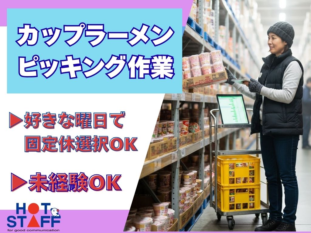8時~17時|好きな曜日で休みが選べる×長期休暇あり|カップ麺を探して集めるだけの簡単モクモク作業♪