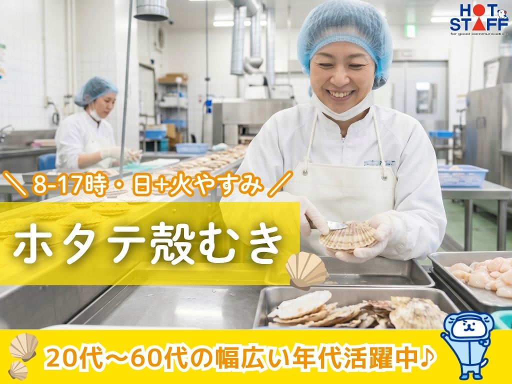 \5/18~20名の大型募集/ホタテをパカっとひらいて身を取るだけ!ぴかぴかキレイな工場です♪