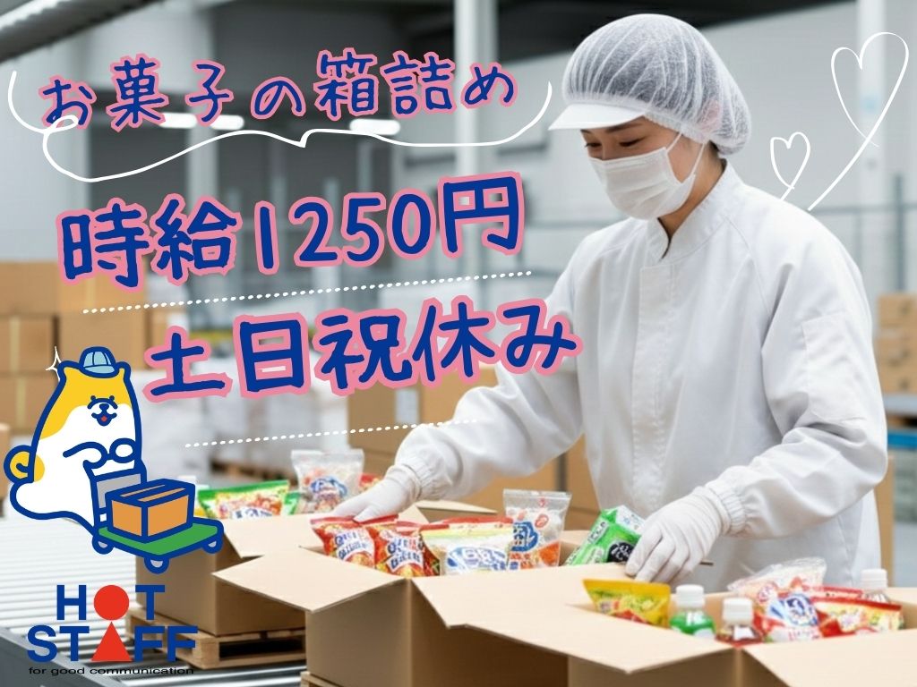 日勤・土日祝休み|工場物流部門お菓子の箱詰め・軽作業スタッフ大量募集スタートはみんな一緒で安心◎