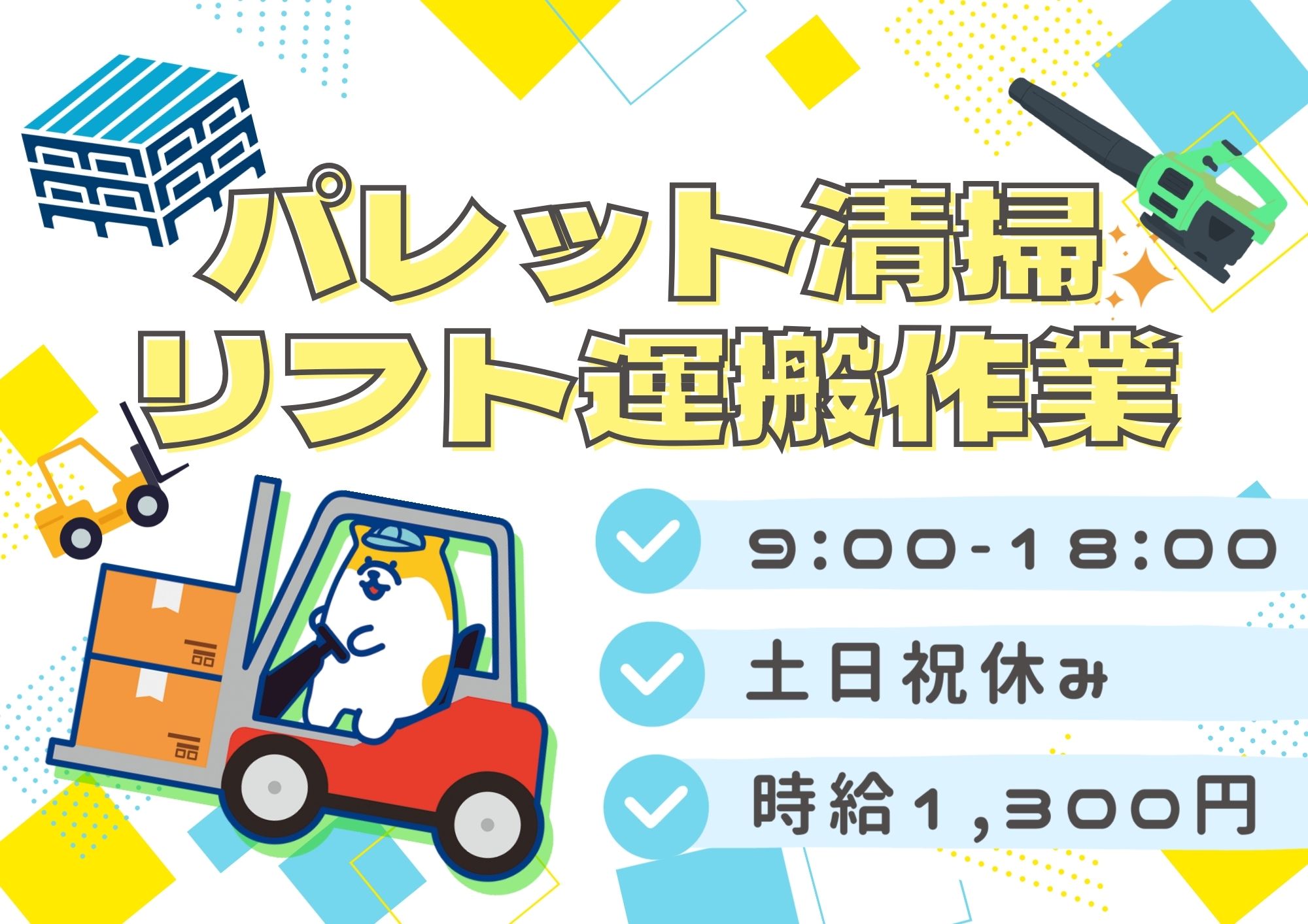 9時~18時|高時給1300円 & 土日祝休み|パレットをササっとお掃除♪あとはリフトで運ぶだけ★