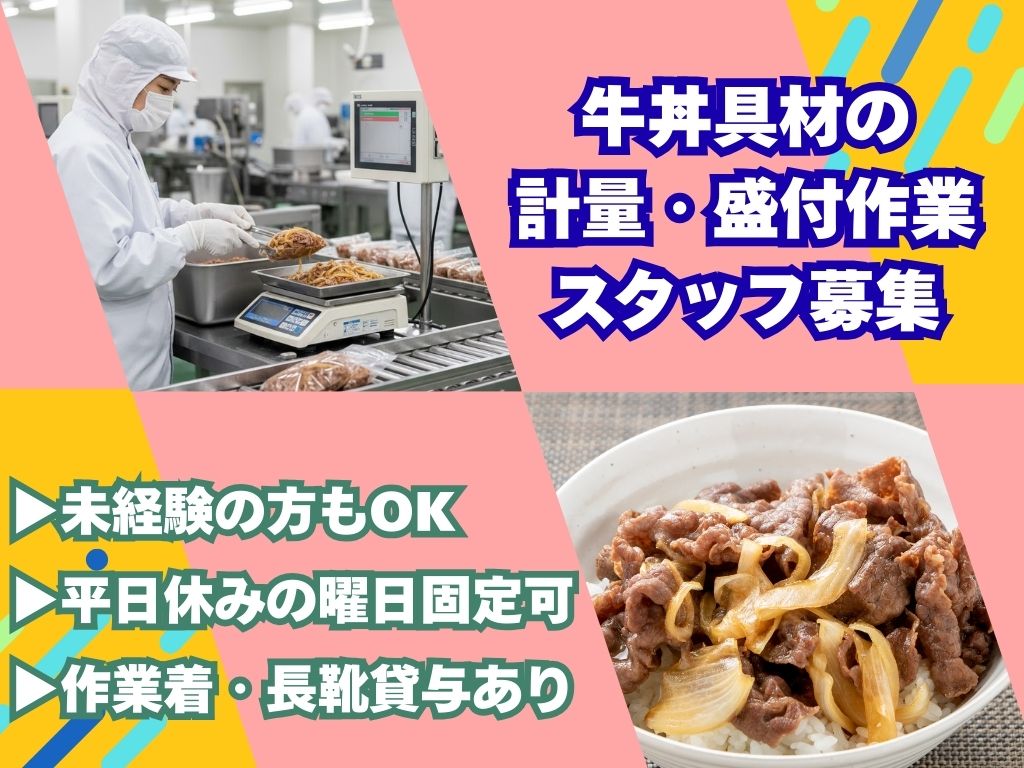 月~金の好きな曜日で休み固定OK|重量物ナシ!包丁の使用もありません♪牛丼具材の計量・盛り付けだけ★
