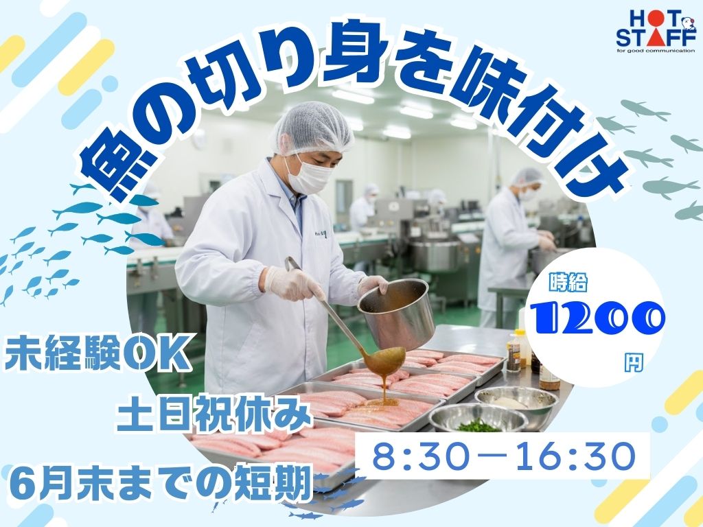 6月迄短期・土日祝・GW休|駅チカ★高時給1200円|魚の切り身に調味料を入れてパックや箱に詰めるだけ◎