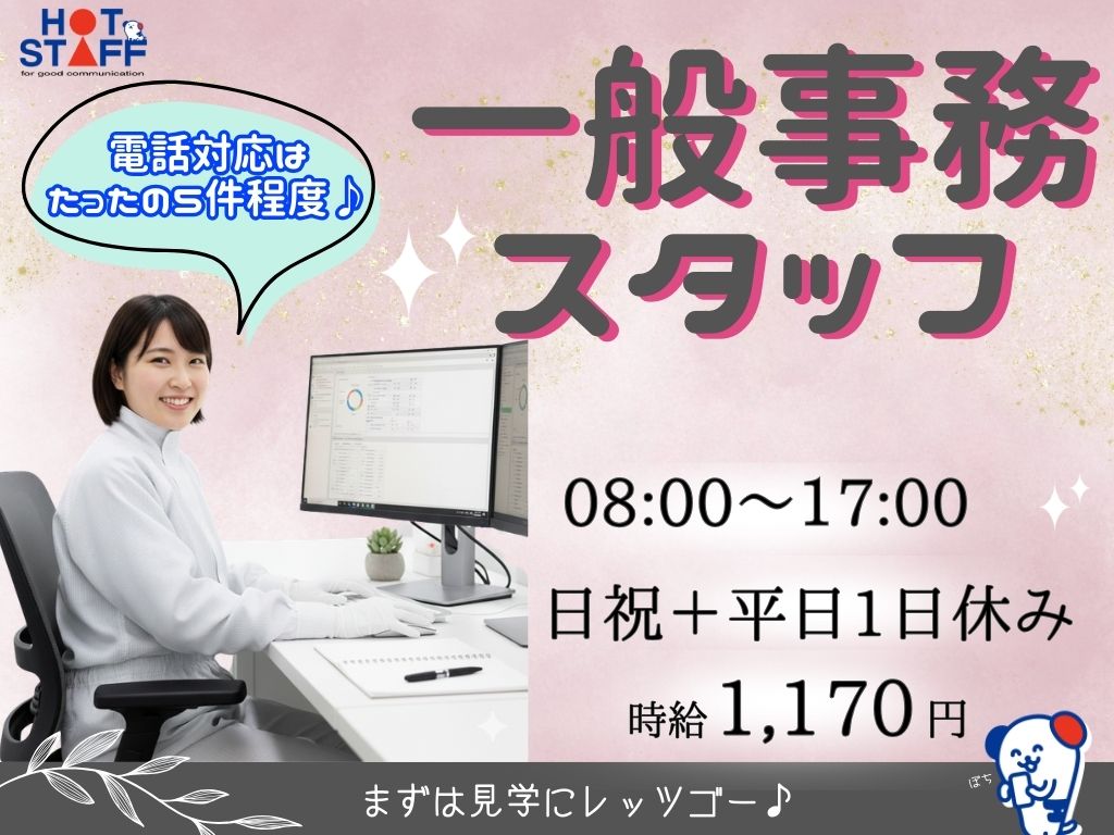 8時~17時|日祝+平日休み&長期休暇あり|電話対応は1日に5回程度と少なめ♪食品工場の一般事務!