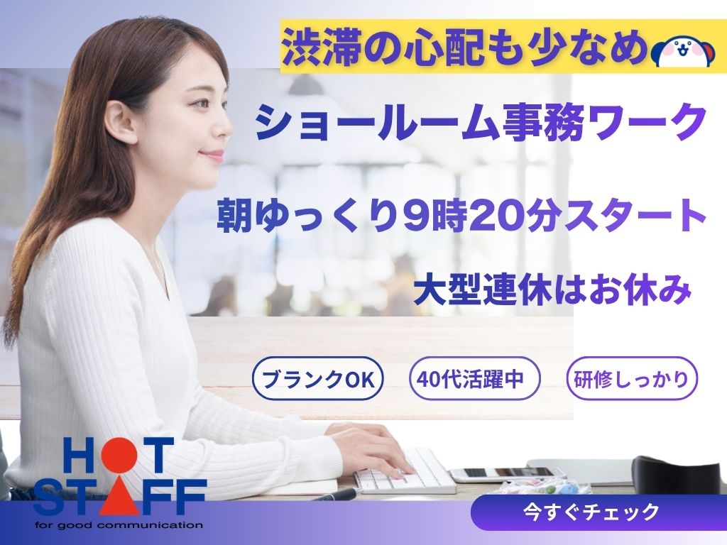 9:20~17:20|ちょっと遅めの出勤で渋滞の軽減ができます!!大人気ショールーム事務スタッフ